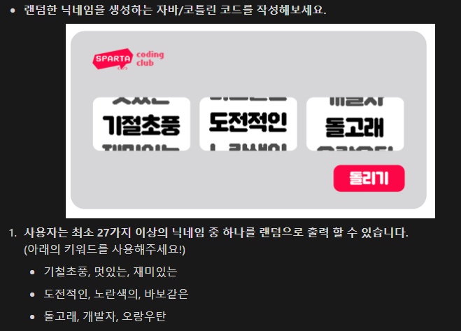 3분류의 키워드들을 랜덤으로 조합하여 닉네임을 생성하는 문제이다. 나는 가장 먼저 배열과 랜덤함수를 사용하여 해결하는것을 떠올렸다.