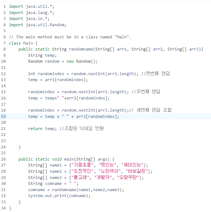 4. (31줄) 조합된 닉네임을 반환받는다.