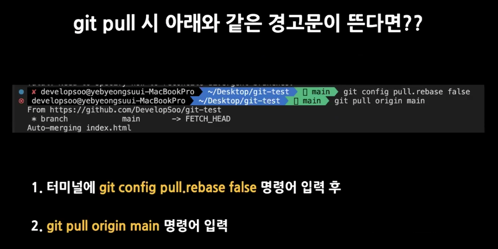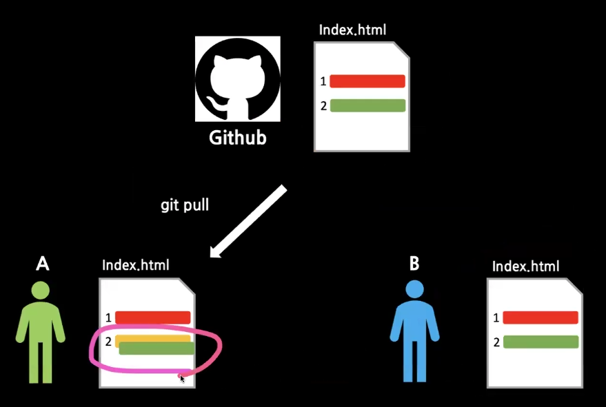 두명 다 2번째 줄 코드를 수정했는데 B가 push한 파일을 pull하면 겹쳐버리는 문제가 발생한다.