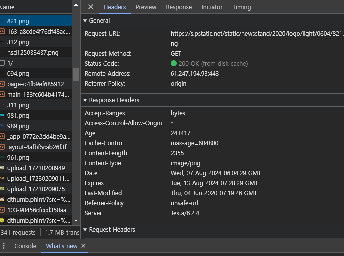 Response Headers : 서버가 웹 페이지 데이터와 함께 보낸 추가 데이터이다.