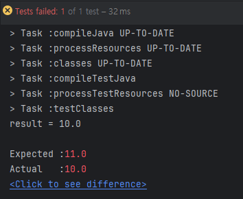 예상값을 11로 바꿨더니 실제 결과인 10과 다르다면서 오류가 발생한다.
