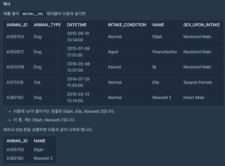 3. WHERE NAME LIKE "%EL%" == 이름에 "EL"이 포함된 (조건1)