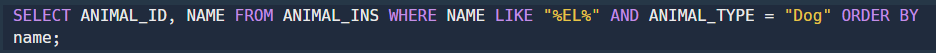 SELECT ANIMAL_ID, NAME FROM ANIMAL_INS WHERE NAME LIKE "%EL%" AND ANIMAL_TYPE = "Dog' ORDER BY name;