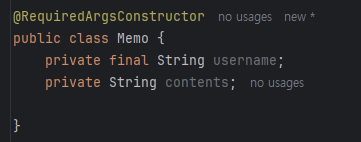 final이 달린 필드만 가지는 생성자를 만들어야 한다. 여기선 username 필드만 초기화하는 생성자를 만들어야 한다. contents도 초기화 하려하면 오류가 난다.