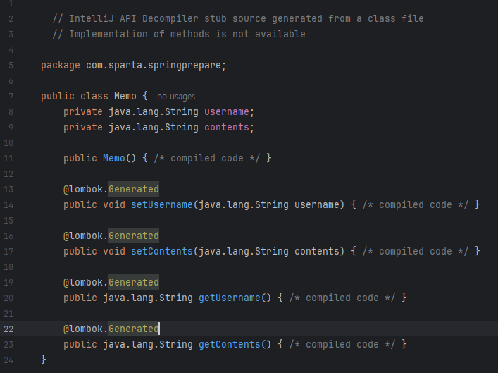 우리는 만든적 없는 getUsername() 메서드와 getContents() 메서드가 생성되어 있는것을 확인할 수 있다.