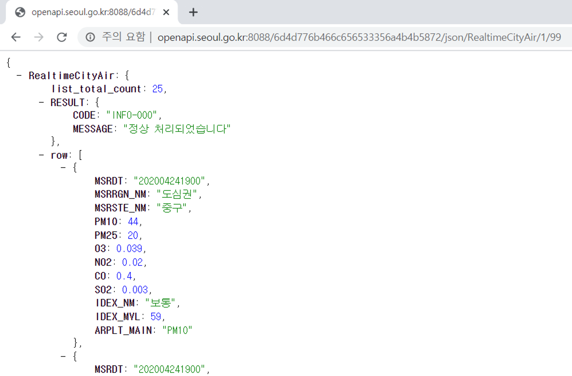 그 후 아래의 URL로 접속해보면 JSON 데이터가 출력되는것을 볼 수 있다.
