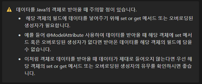 이때 @ModelAttribute 애너테이션을 사용하면 Java의 객체로 데이터를 받아올 수 있다.