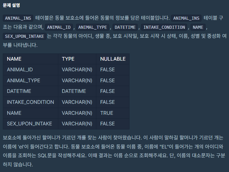 요약 : ANIMAL_INS 테이블에서 이름에 "EL"이 포함된 "개"를 찾아서 "아이디"와 "이름"을 조회하라 단, 결과는 이름순으로 조회한다.