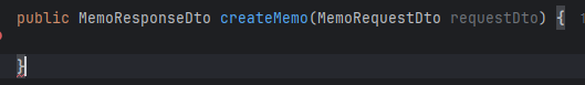메서드 내용에 해당 코드를 추가한다. 그 후 Memoservice클래스의 createMemo 메서드를 만들기 위해 다시 Memoservice 클래스로 이동하고 아래처럼 메서드를 만들어준다.