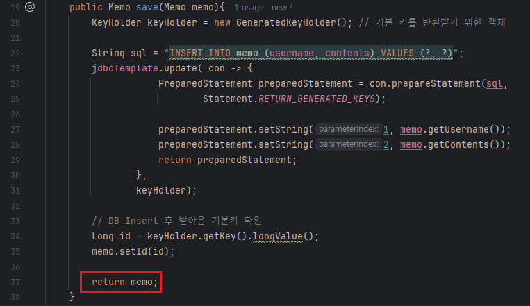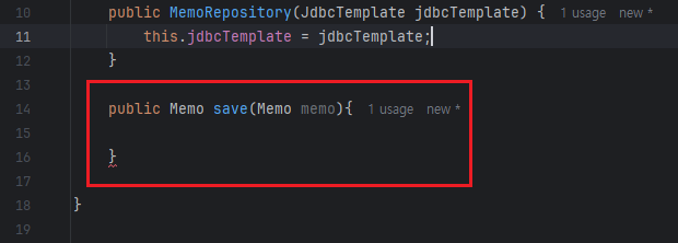 MemoRepository를 호출하는 Service 영역에 다시 가서 DB에 저장하는 함수인 save를 호출하고 저장할 memo 객체를 인자로 전달해준다. 그리고 그 결과값을 반환받게 한다.