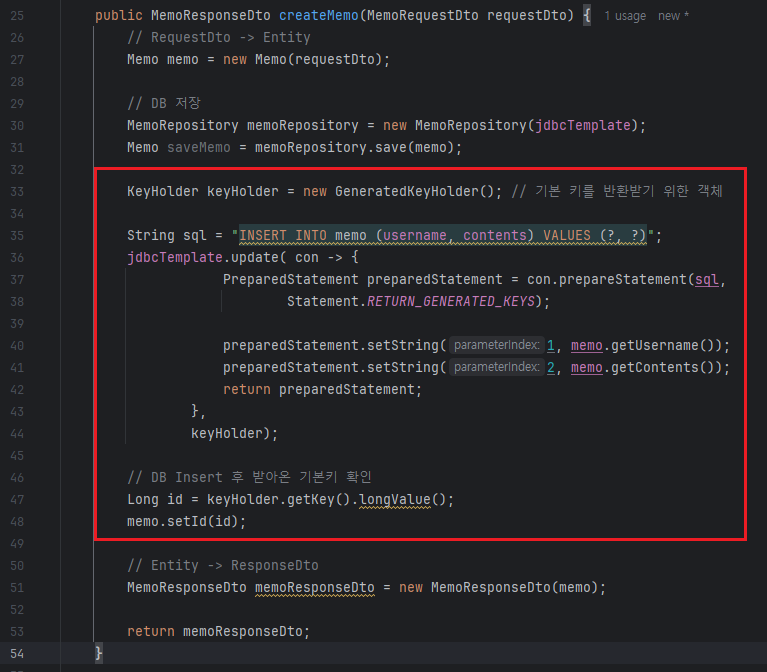 Controller의 반환 타입이 MemoResponseDto이고 그 return 값으로 service의 createMemo의 메서드 반환값을 반환하니 service 부분의 createMemo 메서드도 MemoResponseDto를 반환해줘야 한다.