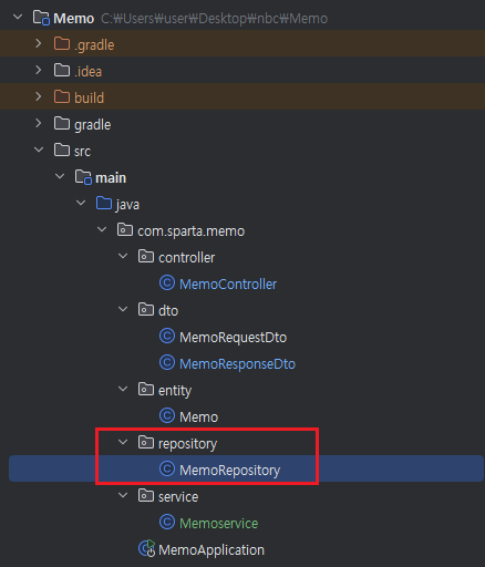 repository 패키지를 생성하고 MemoRepository 클래스를 생성한다.