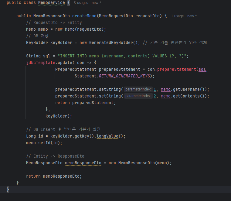 그리고 기존의 Controller의 createMemo의 기능부분을 모두 잘라 Service 담당 메서드에 붙여넣어 준다.