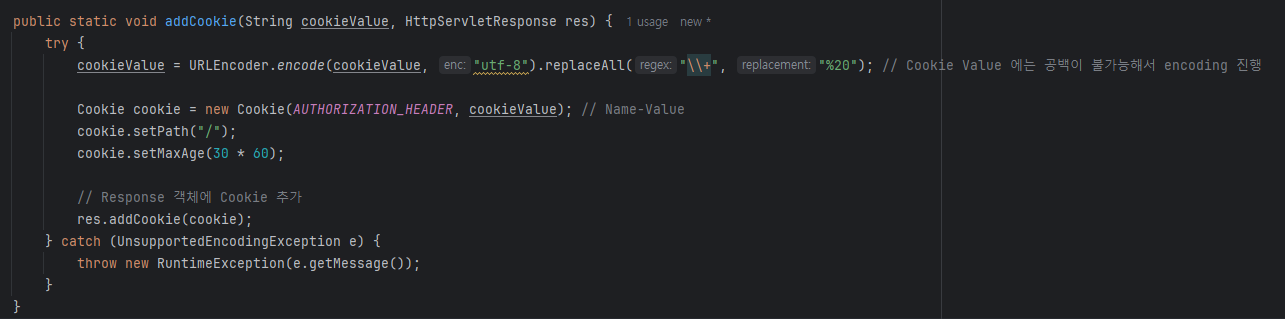 cookieValue = URLEncoder.encode(cookieValue, "utf-8").replaceAll("\\+", "%20"); // Cookie Value 에는 공백이 불가능해서 encoding 진행