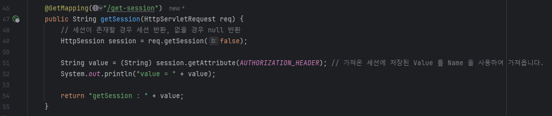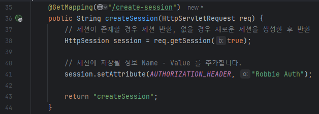38줄은 현재 받아온 Request 객체에 세션이 이미 존재한다면 그 세션을 session 변수에 담고 아니라면 새로운 세션을 담는코드이다.