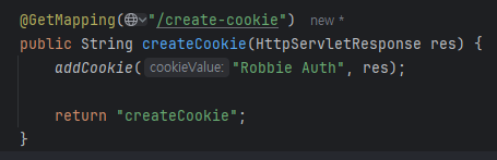 addCookie의 첫번째 인자는 쿠키의 값을 받는다. 잘 보면 여기에 대입되는 값이 "Robbie Auth"인데 띄어쓰기가 되어있다.