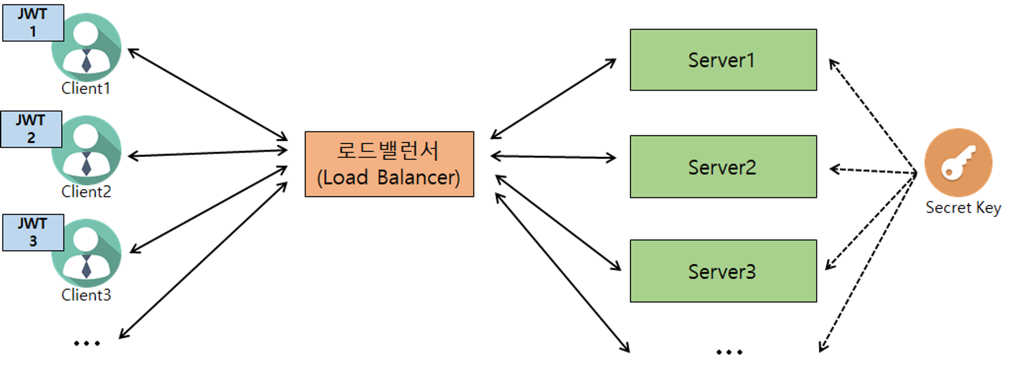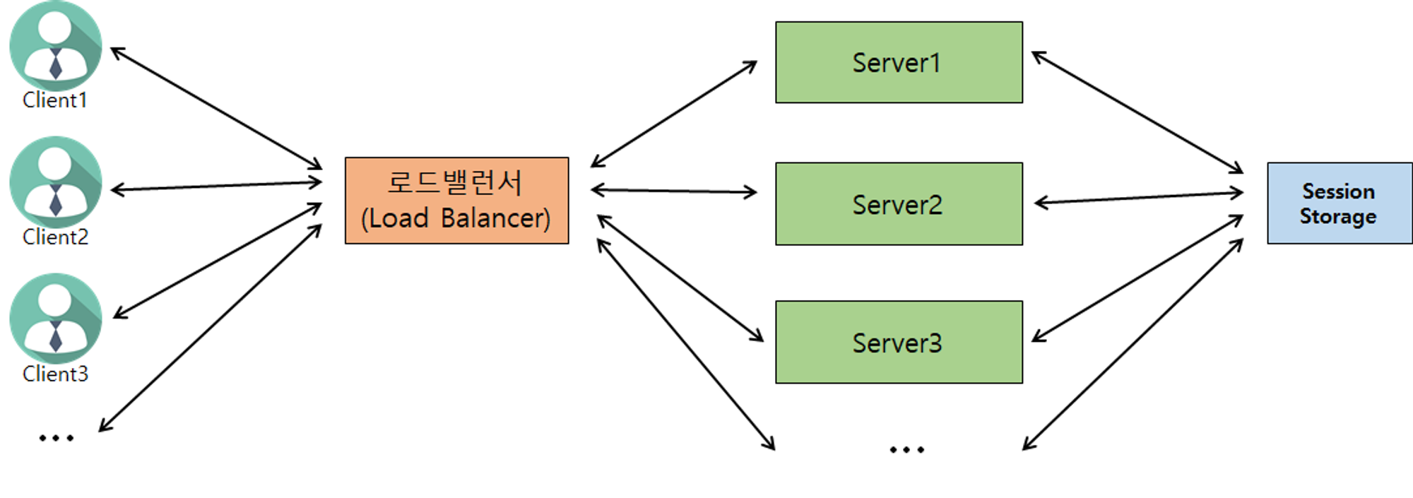 Session storage가 모든 Client의 로그인 정보를 소유하고 있기 때문에 모든 서버에서 모든 Client의 API 요청을 처리할 수 있다.