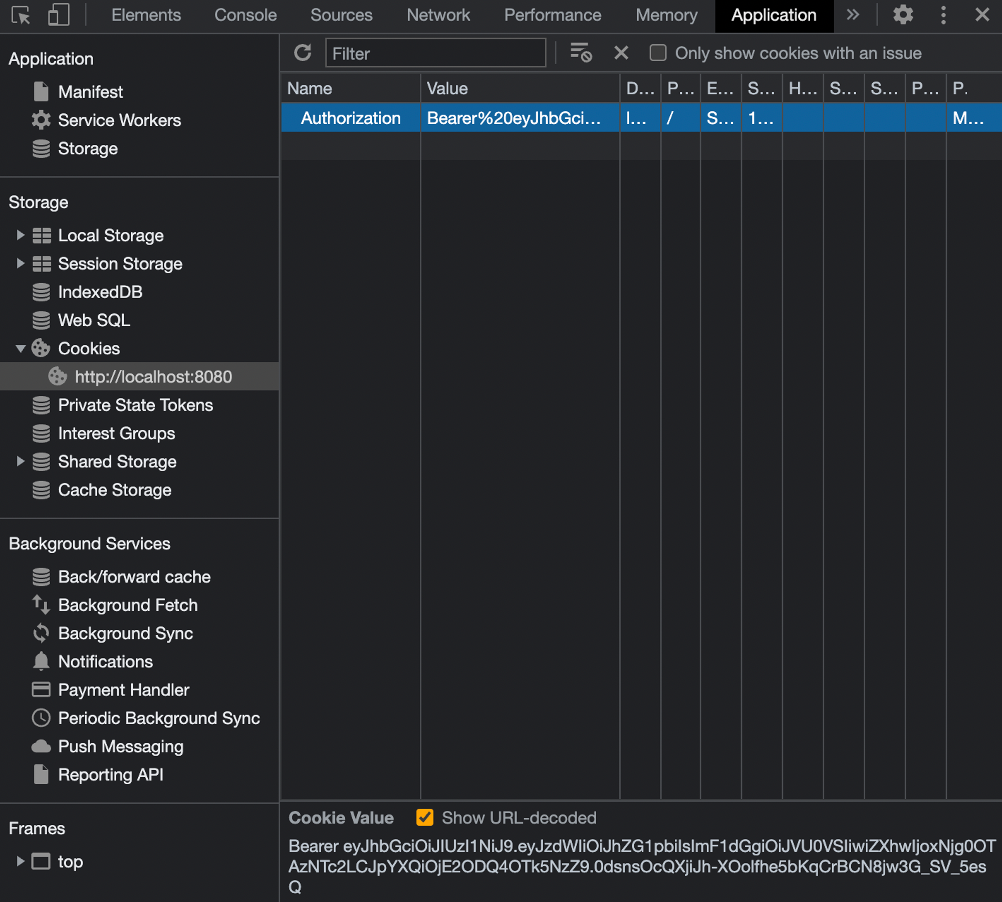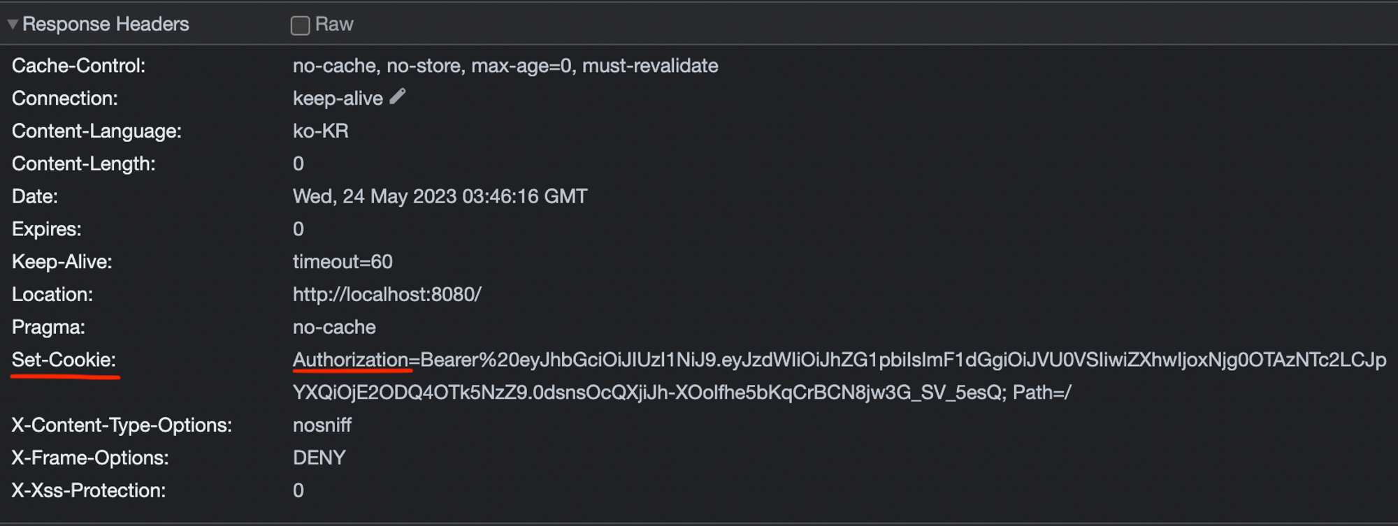 브라우저 쿠키 저장소에 자동으로 JWT 저장됨