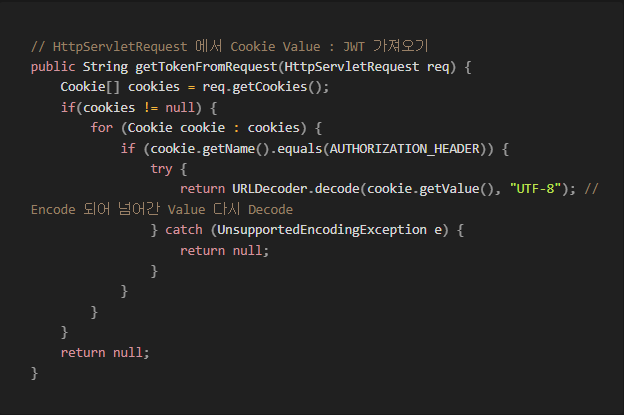 쿠키에 담긴 정보가 여러 개일 수 있기 때문에 그 중 이름이 JWT가 담긴 쿠키의 이름과 동일한지 확인하여 JWT를 가져온다.
