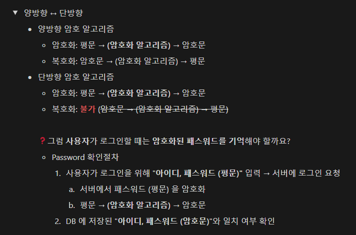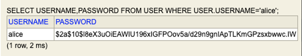 만약 해커가 DB에 있는 앨리스의 패스워드 정보를 갈취하더라도 실제 암호를 알 수 없다. 그래서 복호화가 불가능한 '단방향' 암호 알고리즘 사용이 필요하다.
