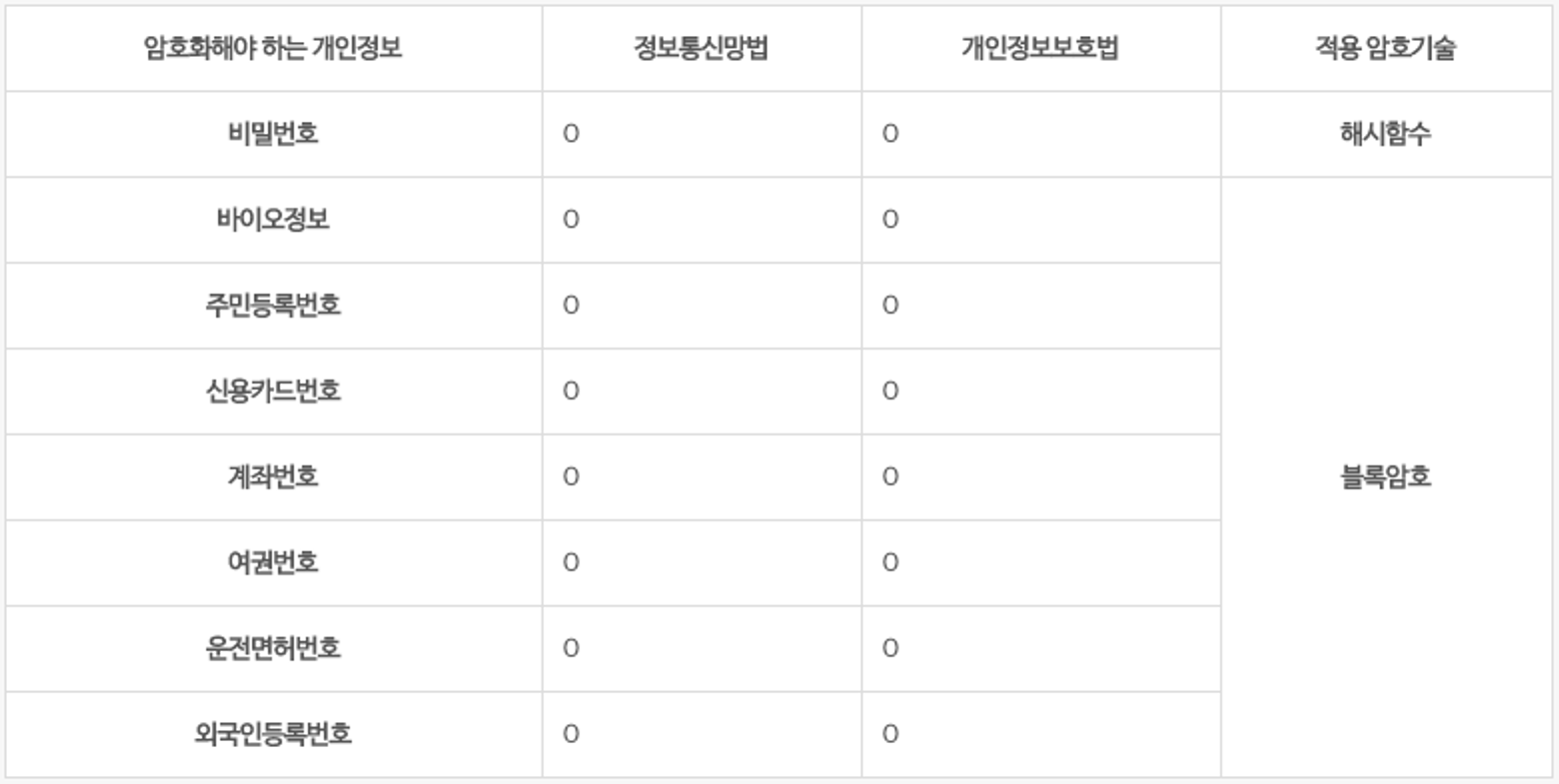 '정보통신망법, 개인정보보호법'에 의해 비밀번호 암호화(Encryption)가 의무이다.