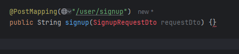 SignupRequestDto 클래스가 없어서 오류가 뜨는데 dto 패키지에 해당 클래스를 만들어준다.