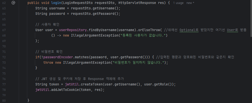 UserService에 JwtUtil 객체가 없었기 때문에 생성자를 통해 JwtUtil 객체를 주입받아왔다.