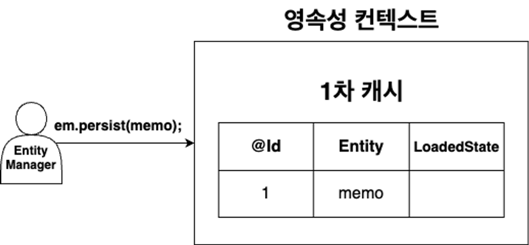 em.persist(memo); 메서드가 호출되면 memo Entity 객체를 캐시 저장소에 저장한다.