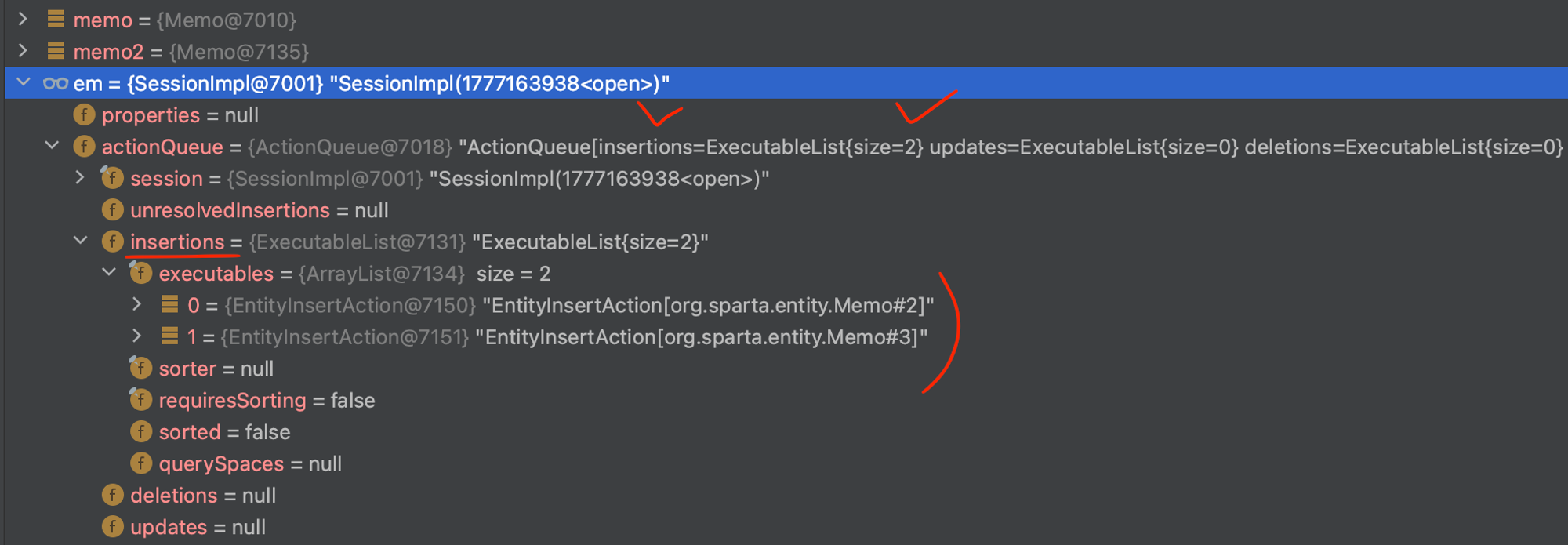 em > actionQueue를 확인해보면 insertions > executables에 Insert할 memo#2, memo#3 Entity 객체 2개가 들어가 있는 것을 확인할 수 있다.