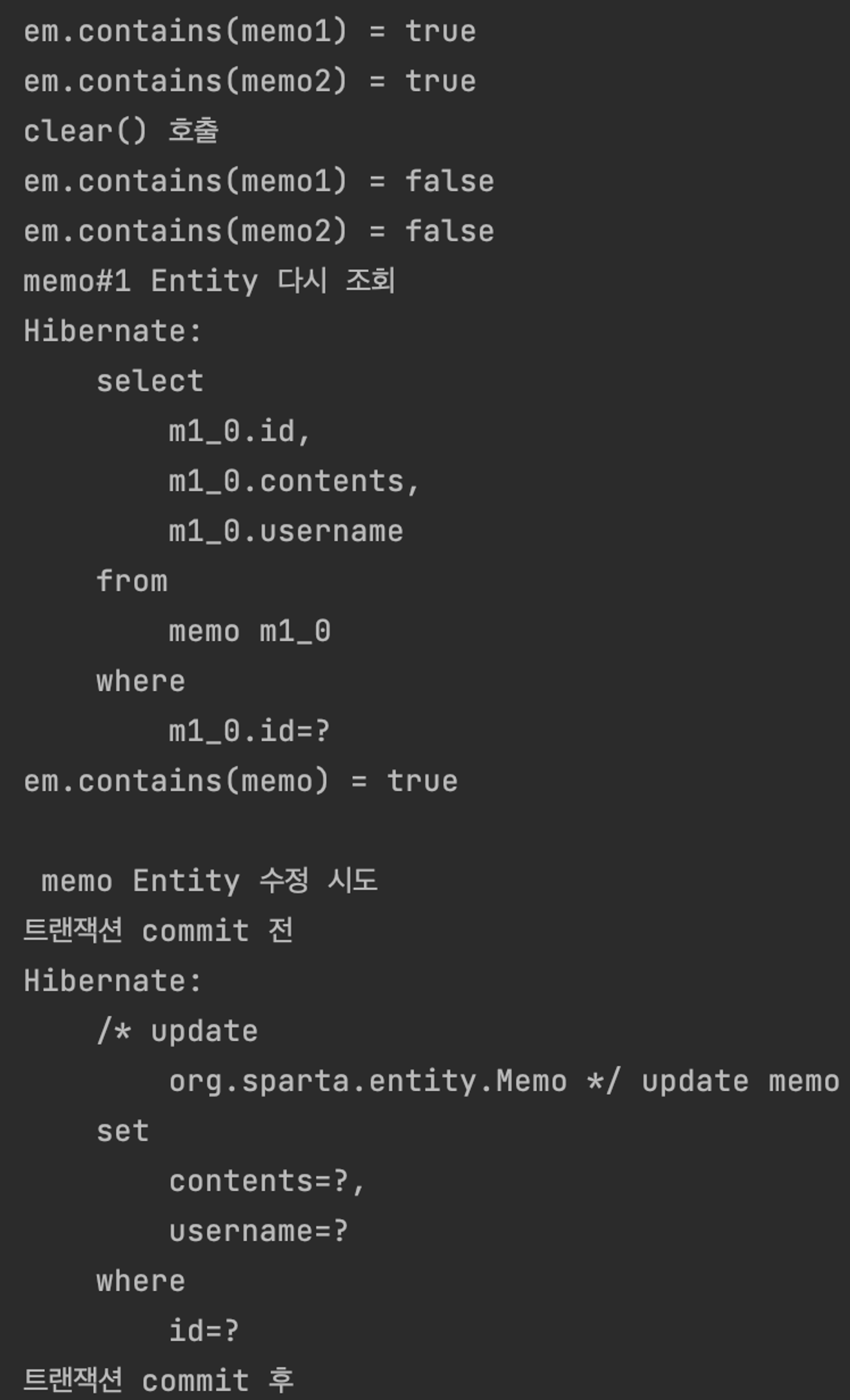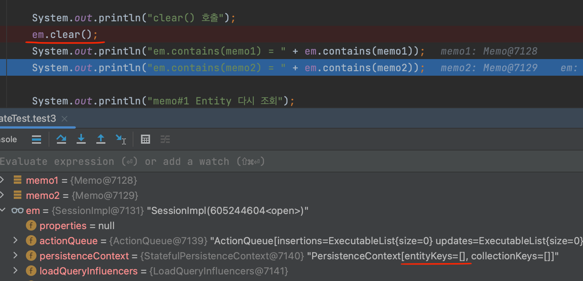 em.clear(); 메서드 호출 후 em.contains(memo1,2); 확인했을 때 false가 출력된 것을 확인할 수 있다.