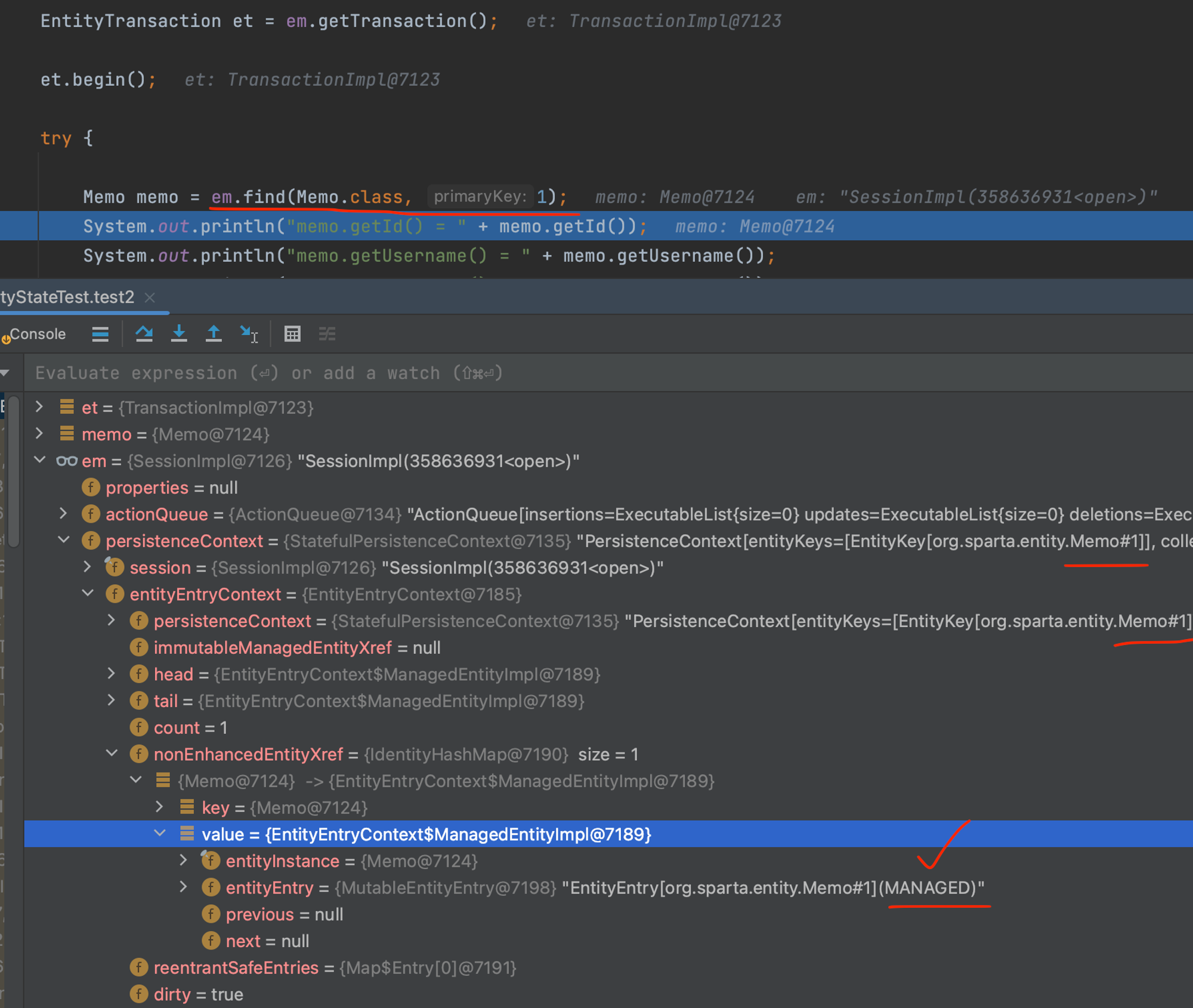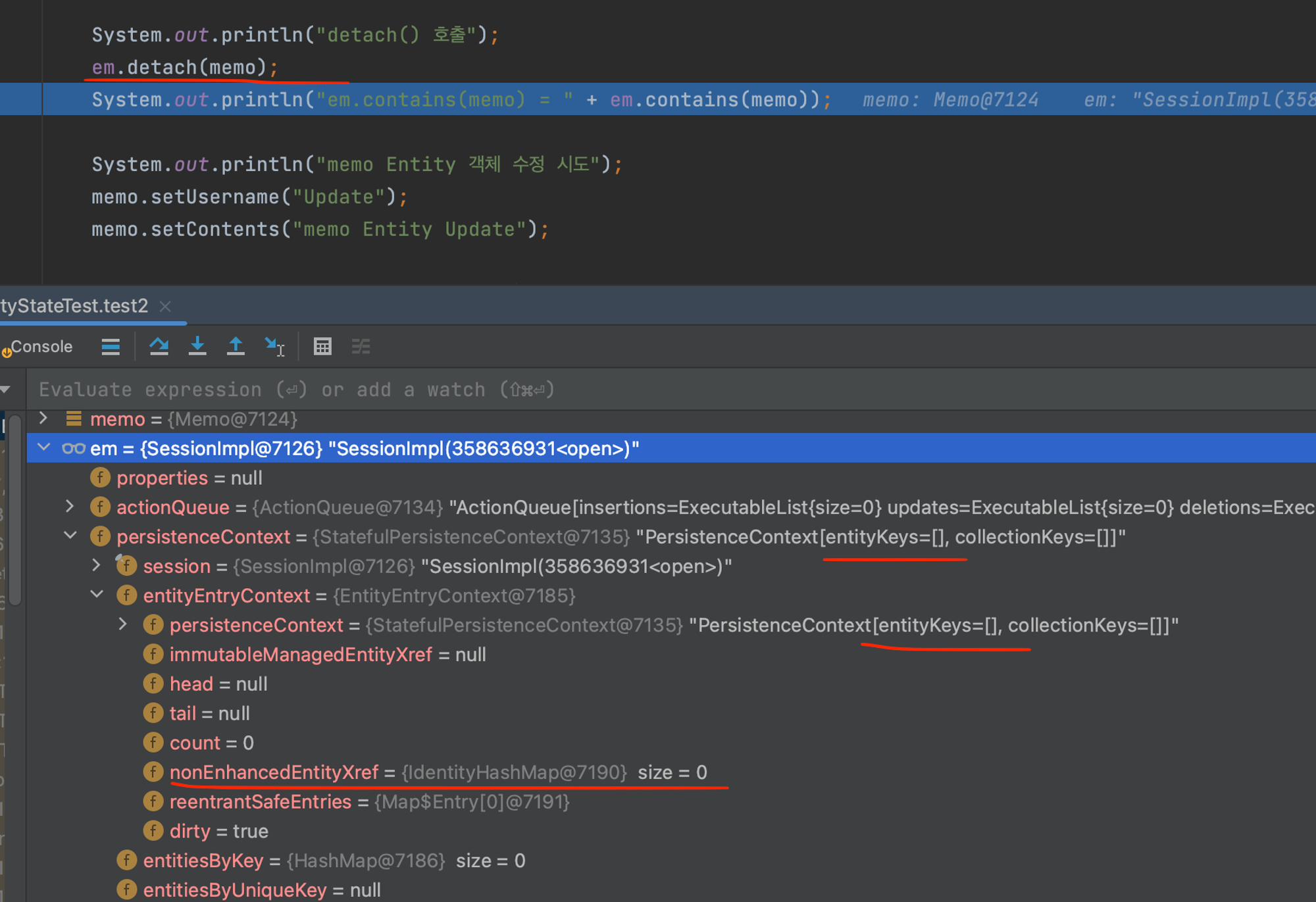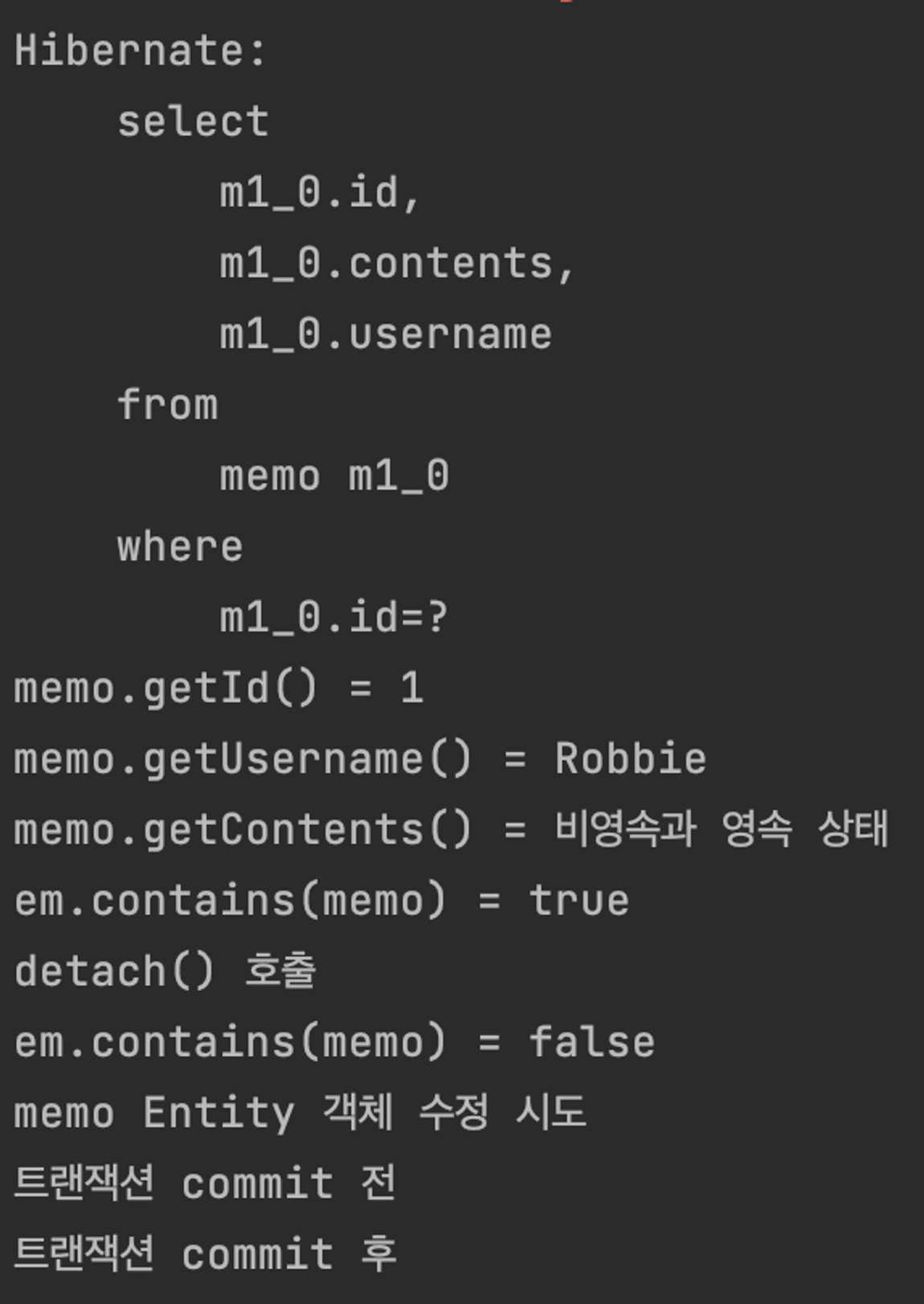 다시 memo#1 Entity를 조회한 후 em.contains(memo); 확인했을 때 true가 출력된 것을 확인할 수 있다.