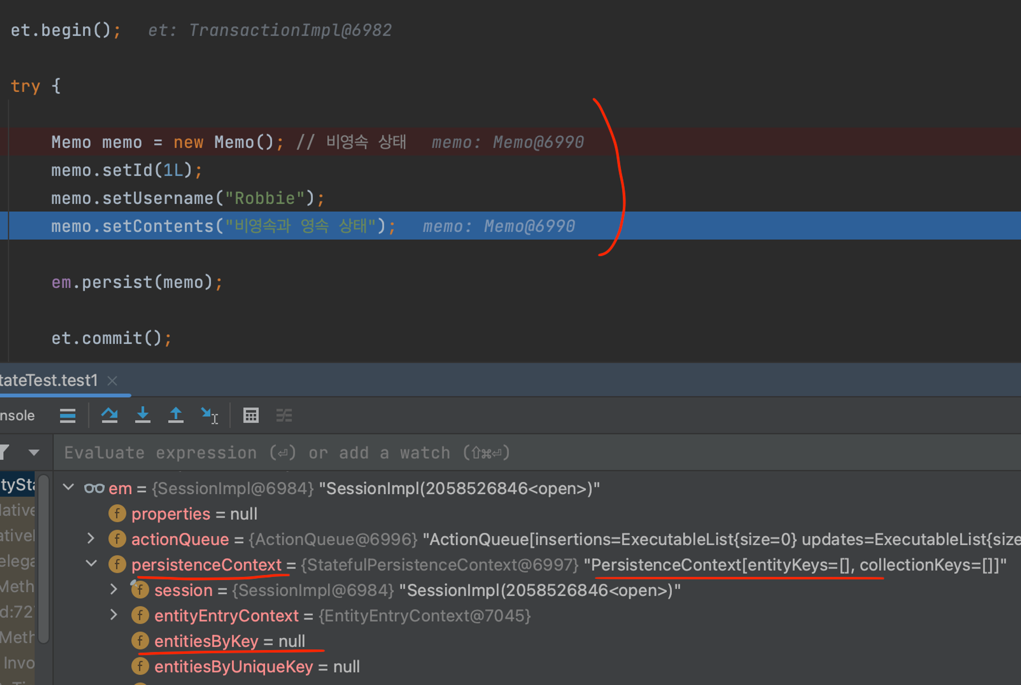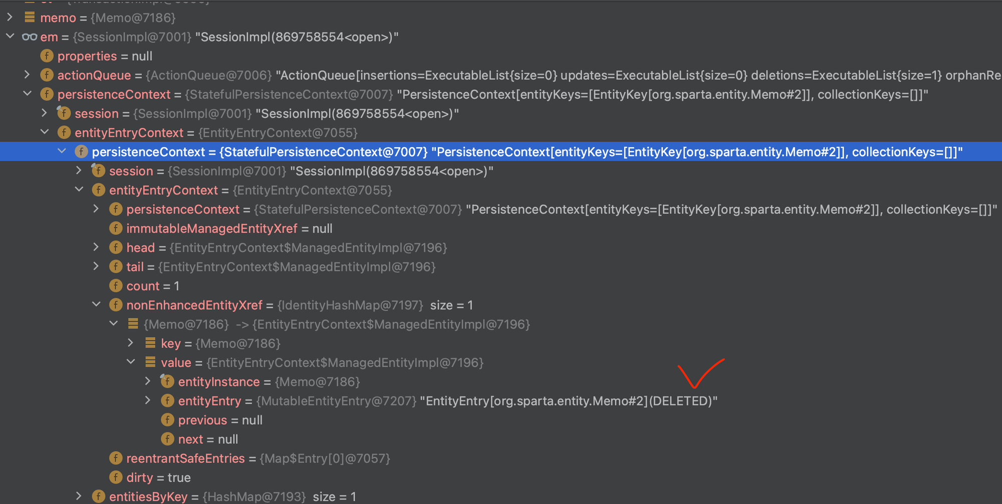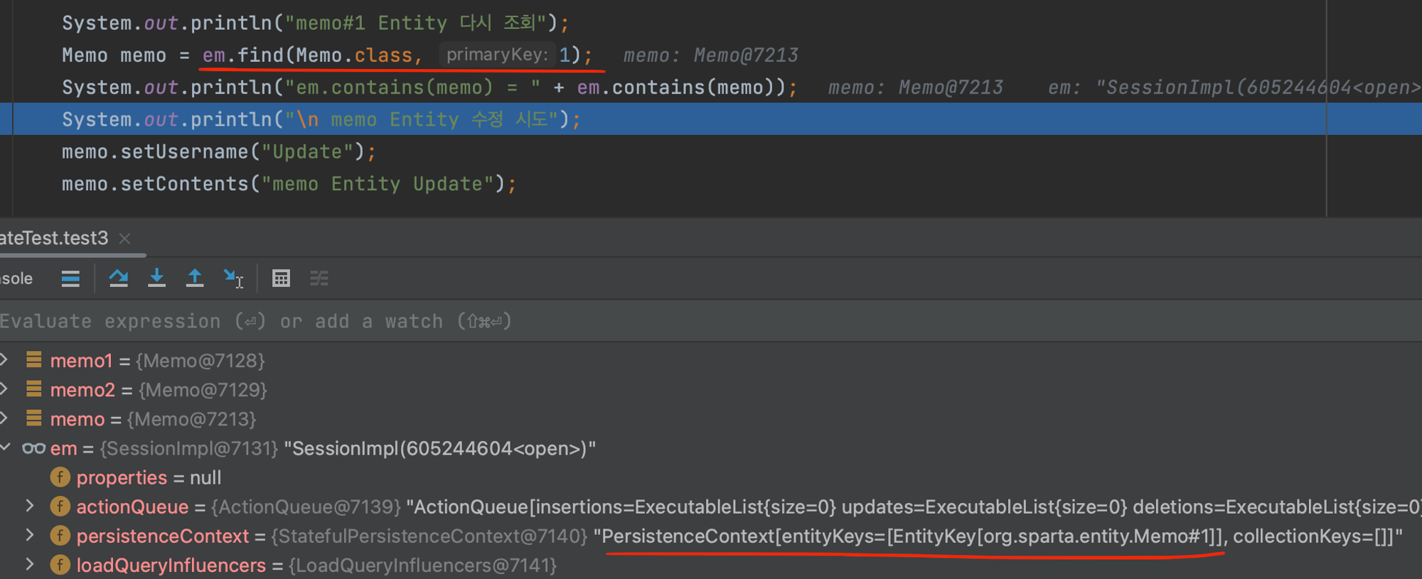 다시 memo#1 Entity를 조회한 후 em.contains(memo); 확인했을 때 true가 출력된 것을 확인할 수 있다.