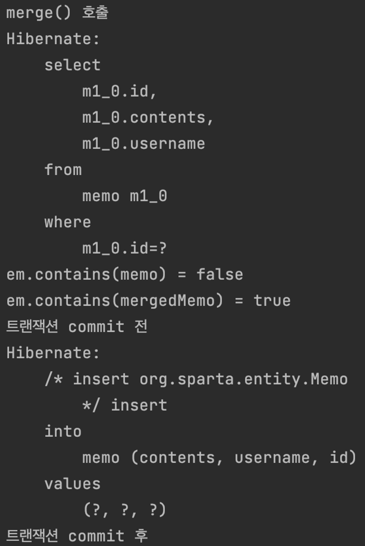 em.merge(memo); 호출 후 영속성 컨텍스트에 해당 값이 없어 DB에 조회 했는데도 해당 값이 없기 때문에 새롭게 생성하여 영속성 컨텍스트에 저장하고 Insert SQL이 수행되었다.
