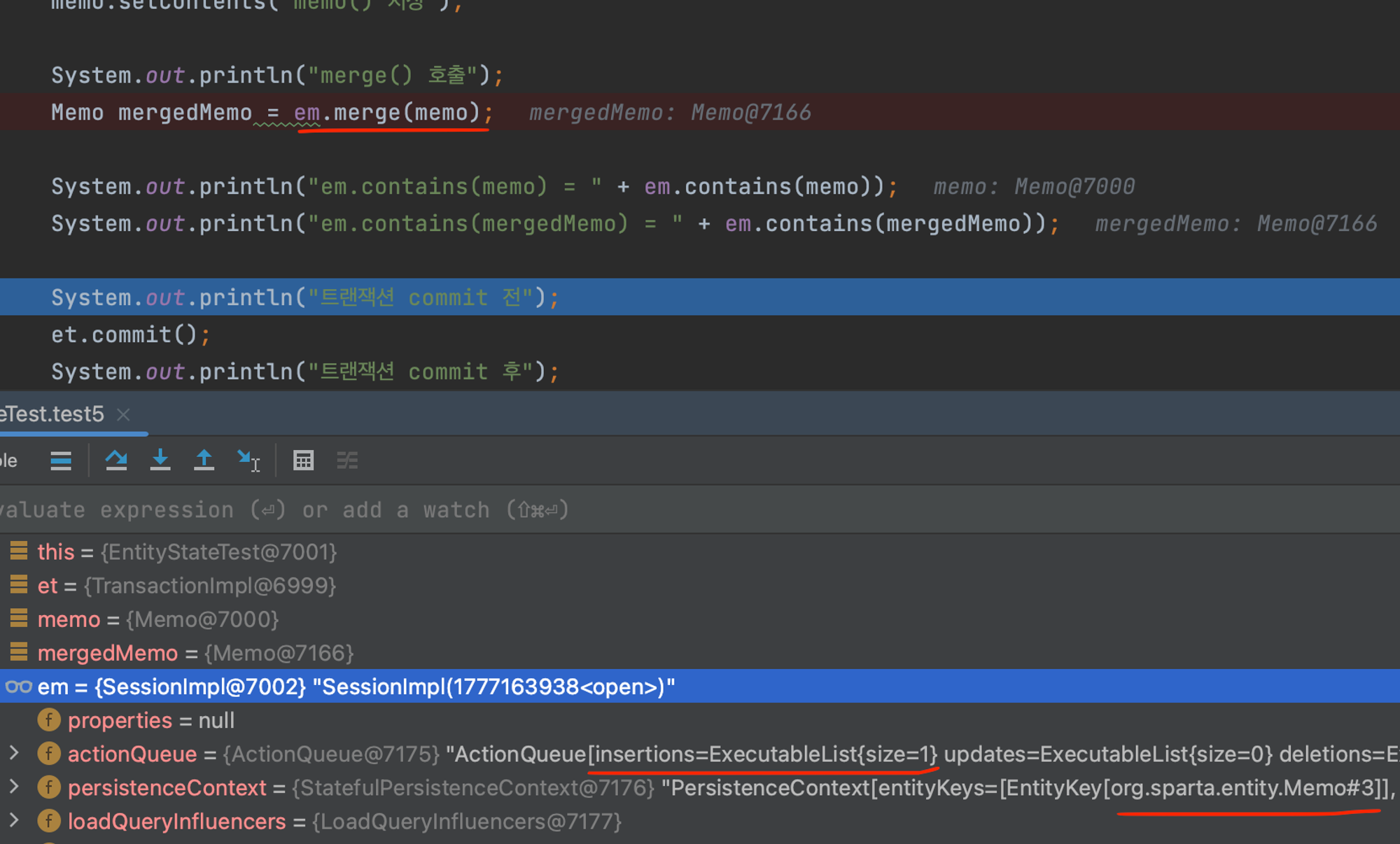 em.merge(memo); 호출 후 영속성 컨텍스트에 Memo#3 객체가 저장되고 Insert SQL이 추가된 것을 확인할 수 있다.