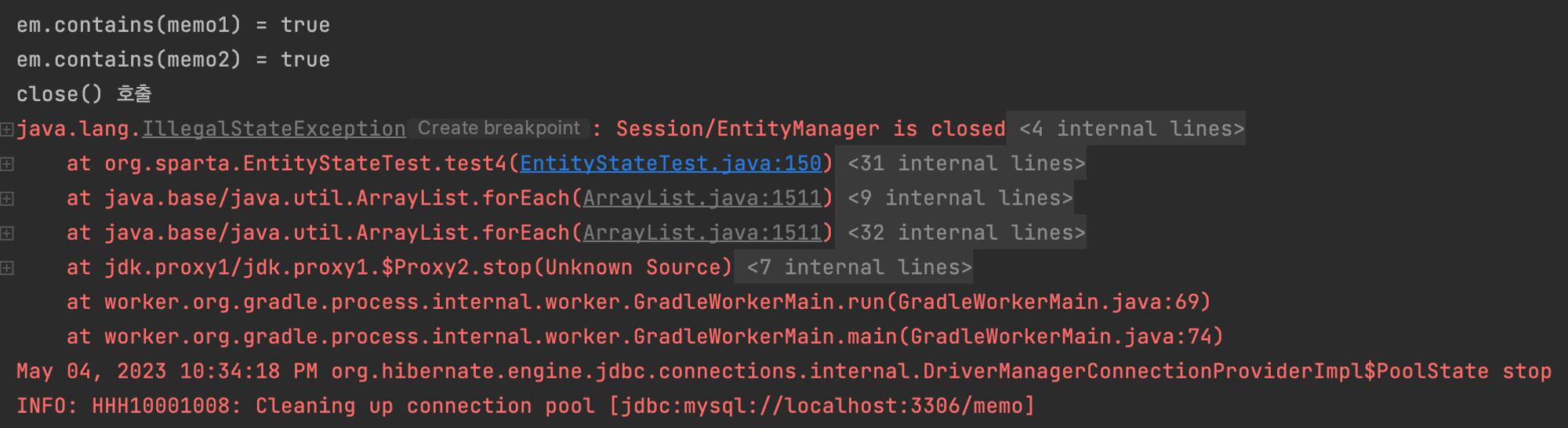 영속성 컨텍스트가 종료되면 계속해서 영속성 컨텍스트를 사용할 수 없다는 것을 확인할 수 있다.