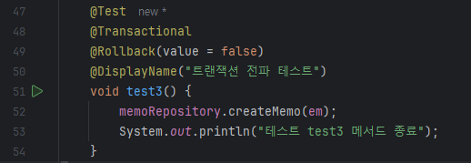 test3 메서드에서 memoRepository에 있는 createMemo 메서드를 호출하고 있다. 즉 test3는 부모 메서드라고 한다.