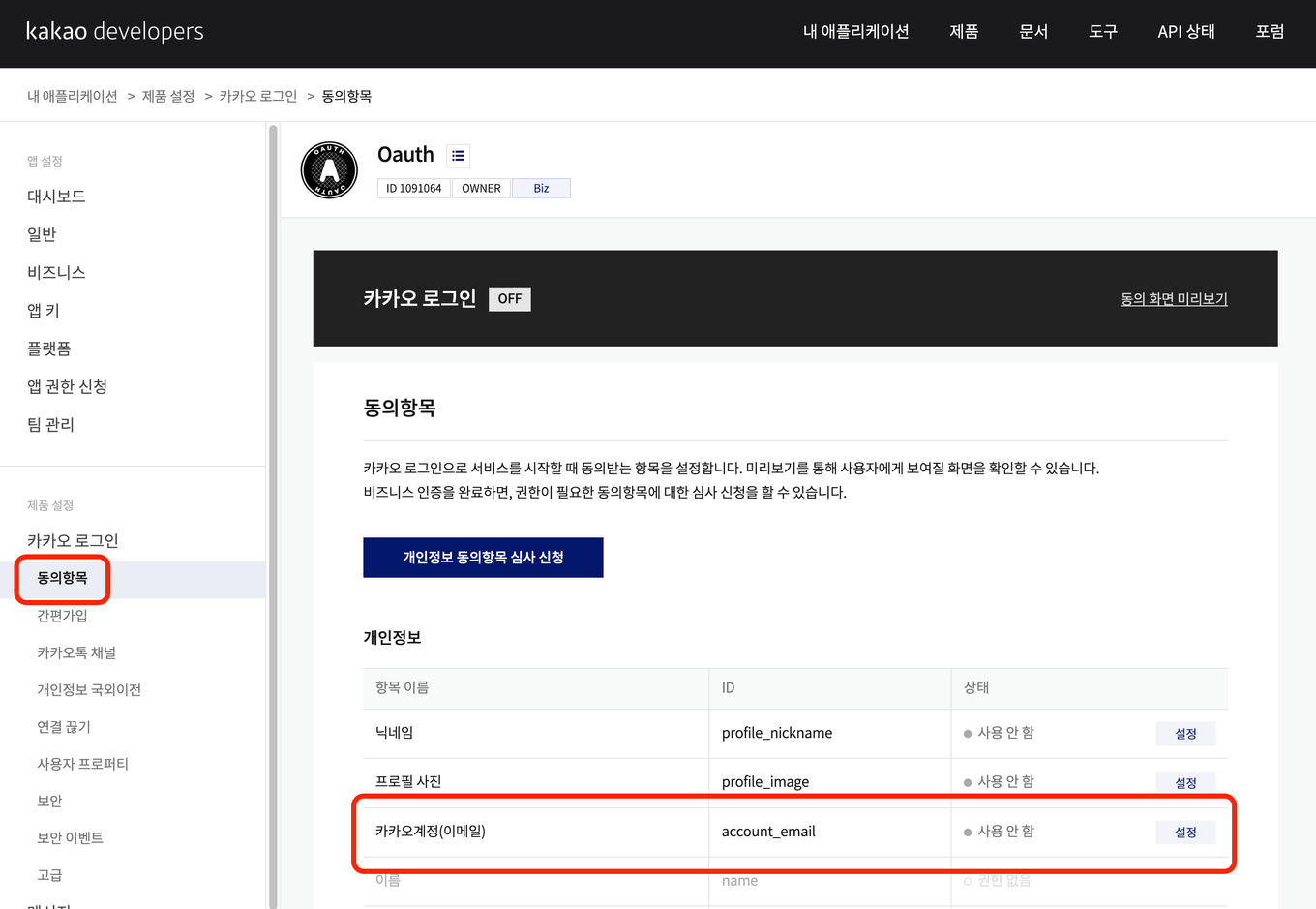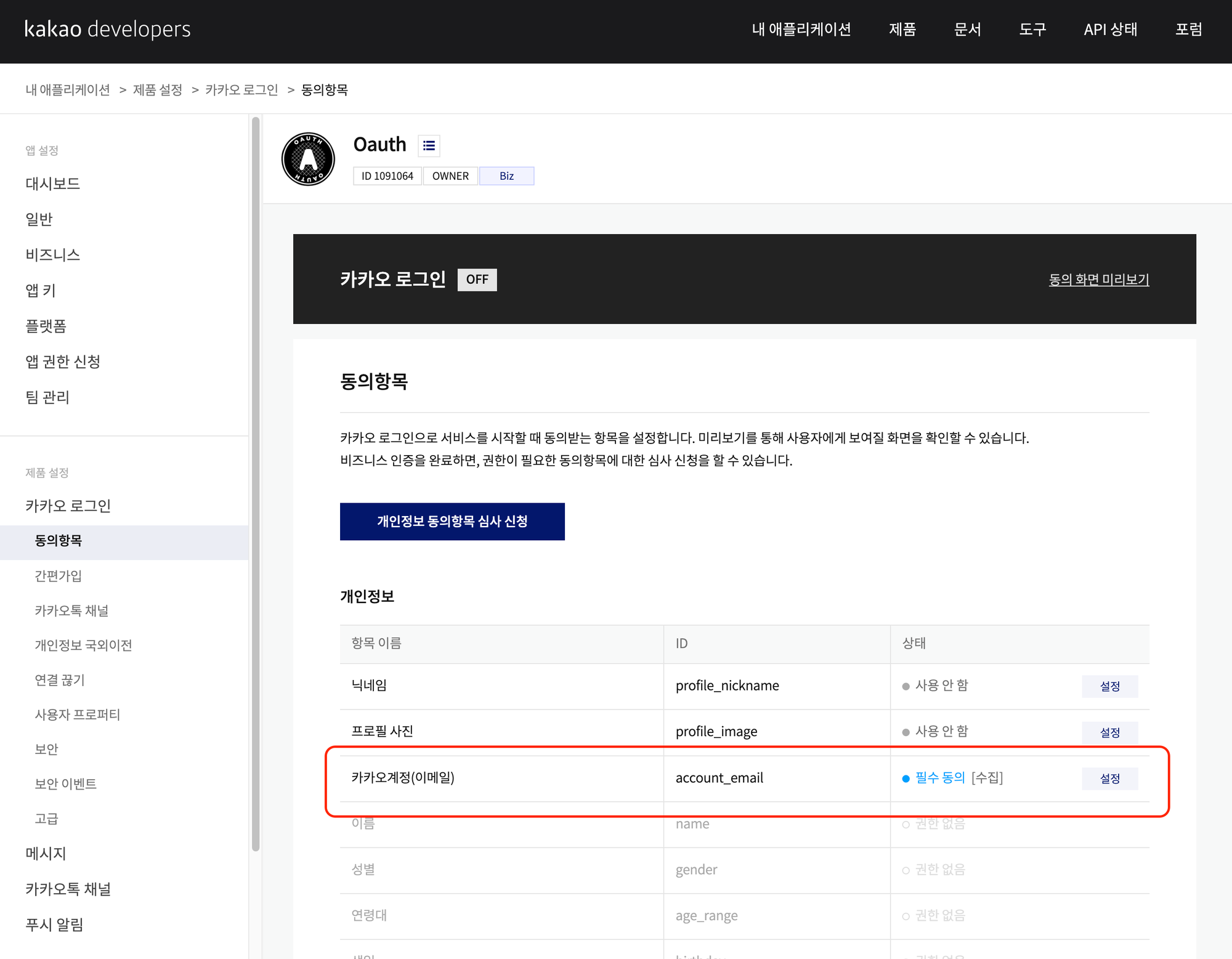 카카오 서버로부터 사용자의 어떤 정보를 받을지 정할 수 있다.