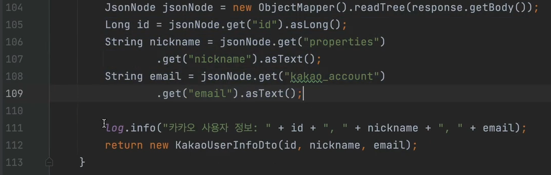 즉, 응답값 Json 데이터중에서 id와 properties와 kakao_account를 받겠다는 것이다.
