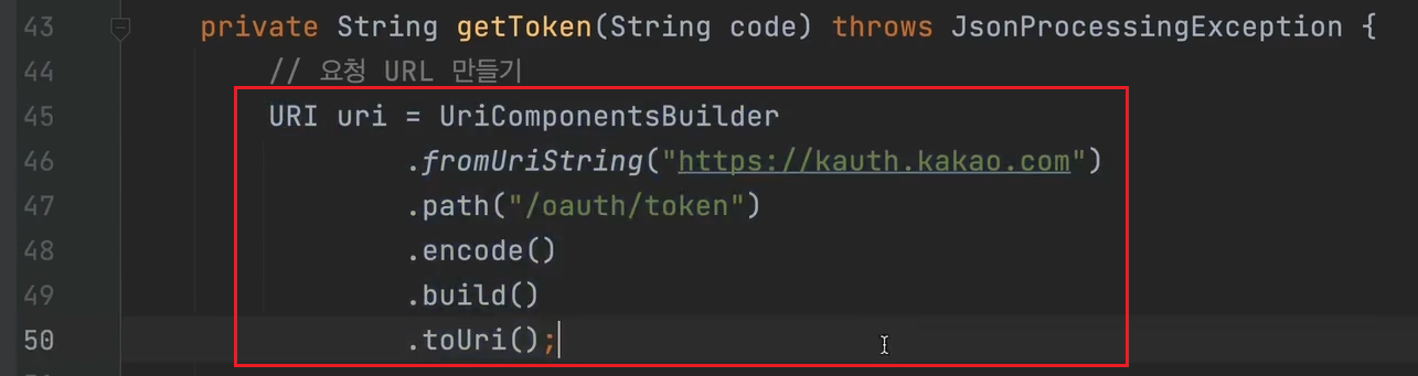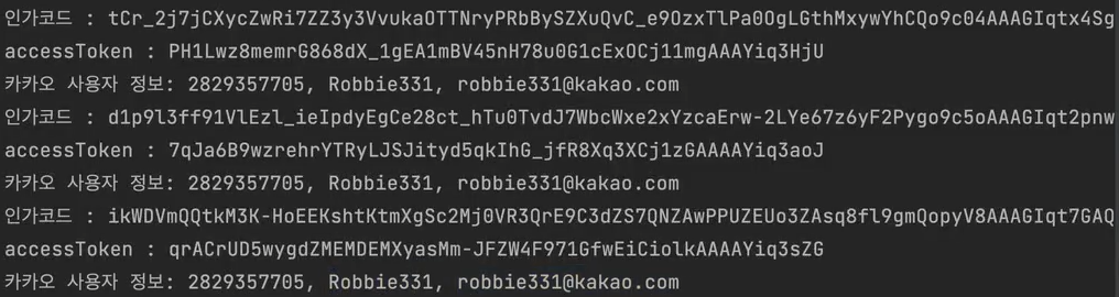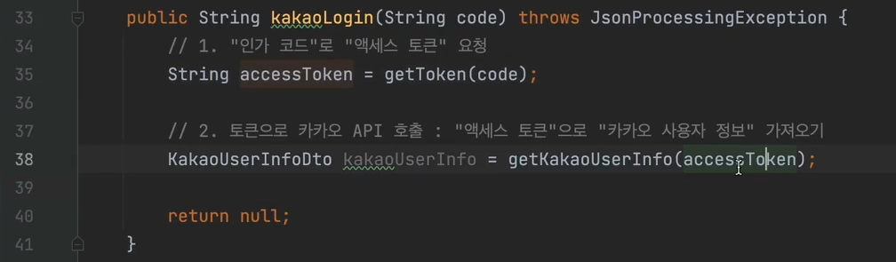 getToken 메서드로 accessToken을 받았다. 이걸로 사용자 정보 요청 메서드에 매개변수로 넣어 사용자 정보를 요청한다.