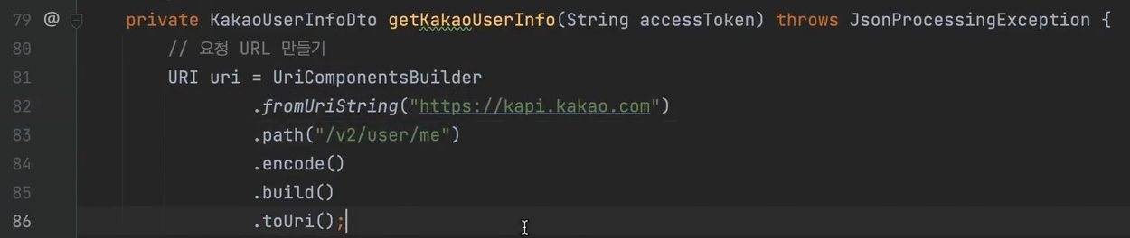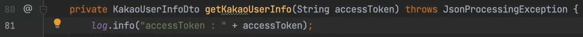 81번째 줄 : KakaoService.kakaologin() 함수에서 받아온 String값은 JWT이다. 그것을 변수에 받는다.