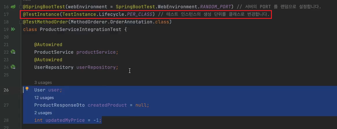 이제 테스트 메서드들이 공유된 필드들을 이용해 순서대로 동작하면서 제대로 기능을 수행하는지 테스트를 하게된다.