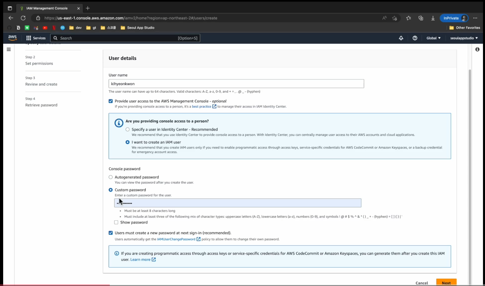 유저의 이름과 웹 AWS 콘솔에 접근 허용 여부, 패스워드를 자동생성 또는 직접 생성, 그리고 다음 로그인 시 비밀번호 변경할 것을 요구하는 옵션들이다.