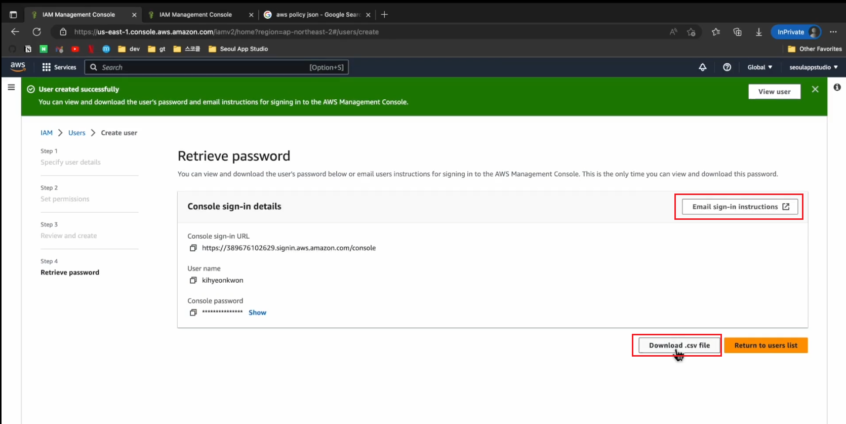 Download.csv file : 현재 Console password는 Show를 클릭하면 볼 수 있는데 이 페이지에서 나가면 볼 수 없다. 이걸로 다운로드 해놓으면 저장해서 볼 수 있다.