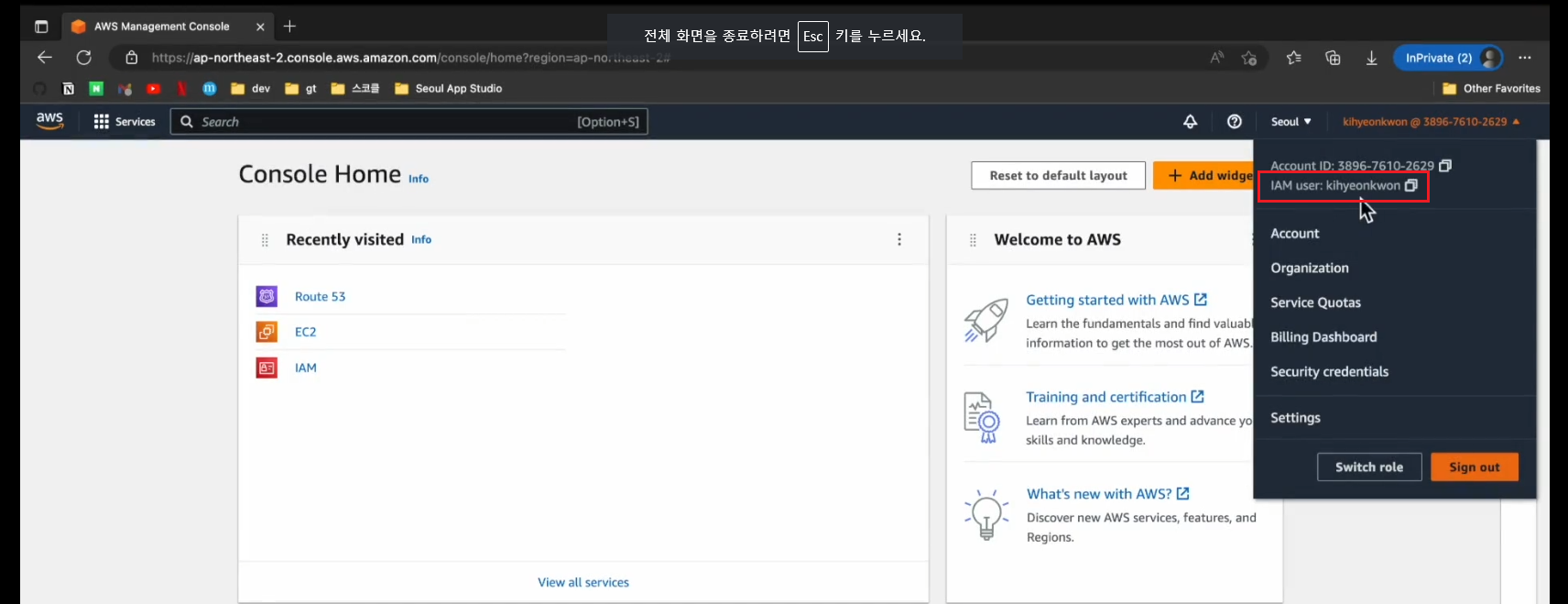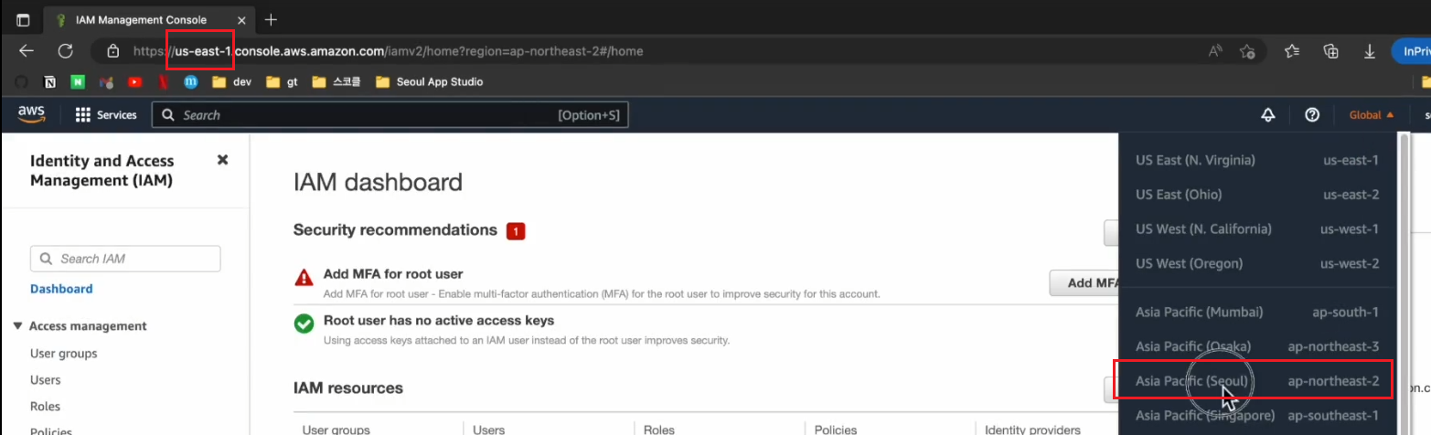 들어가면 Region이 us-east-1 로바뀐것을 알 수 있다. Region을 Seoul로 바꾼다.