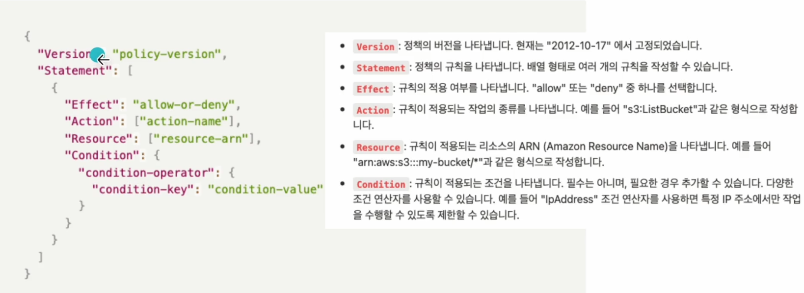 3. 권한 검증 : IAM을 사용하여 사용자가 AWS 리소스에 대한 액세스를 요청할 때 요청이 인증된 사용자에게 허용되는지 여부를 결정할 수 있다. IAM은 권한 검증을 수행하기 위해 사용자가 AWS 리소스에 대한 액세스를 요청할 때 IAM 정책을 적용한다.
