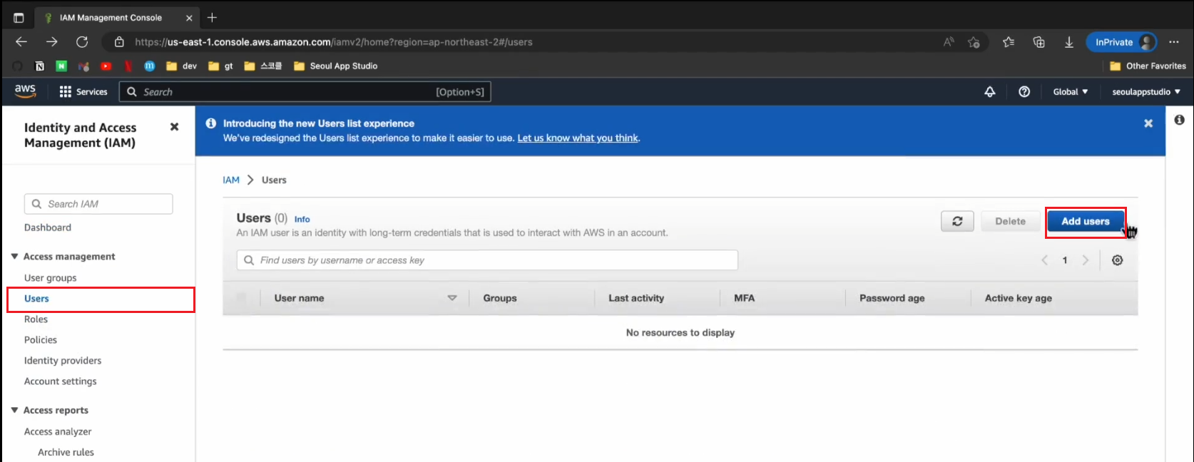 우리는 User 하나 만들어볼것이다. Users - Add users 클릭