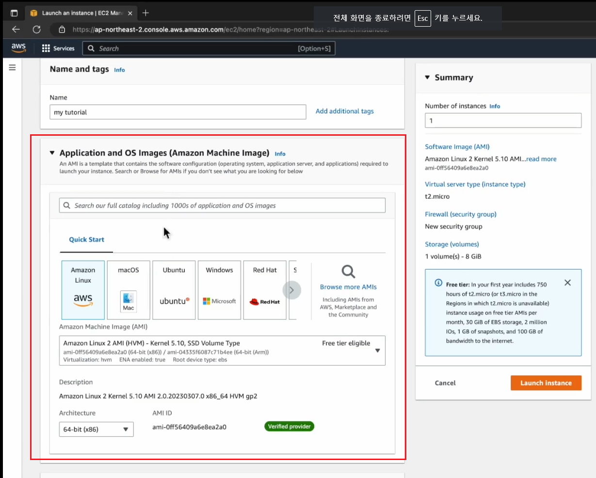 EC2에 깔 OS의 이미지를 선택하는 부분이다.