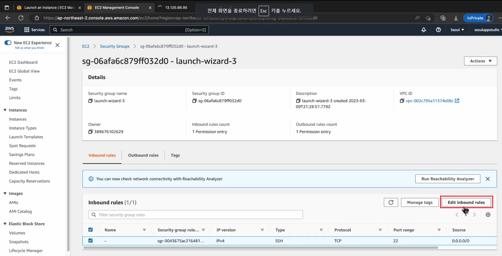 열어주기 위해서 Security groups에 있는 링크를 클릭한다.