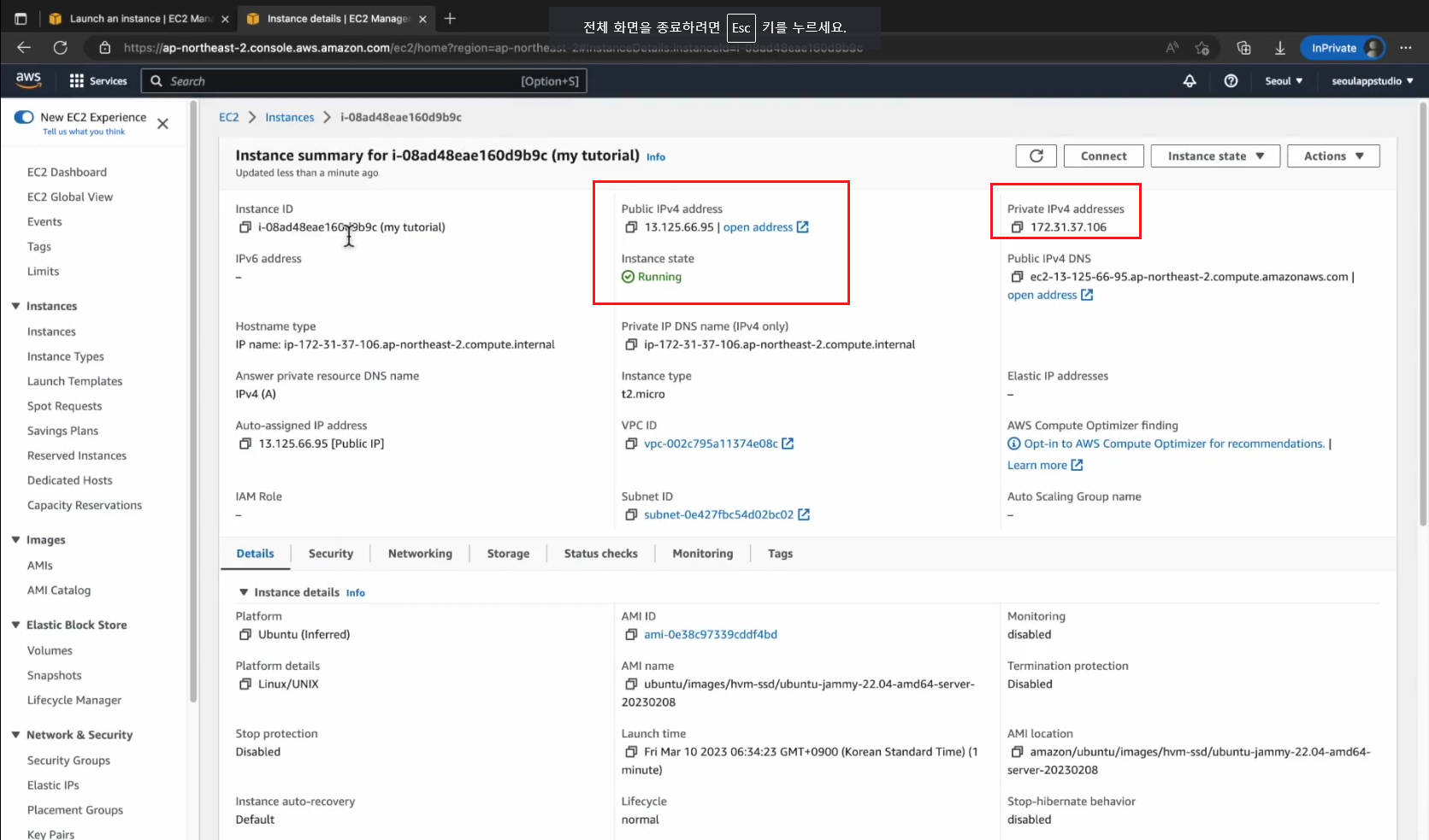 Public IPv4 address : 외부에서 인스턴스에 접근하기 위한 IP