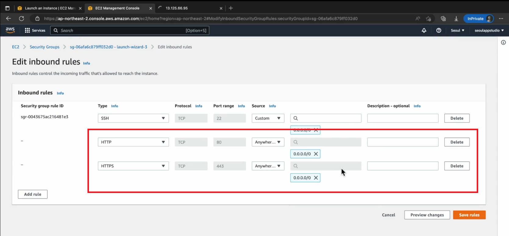 HTTP와 HTTPS의 모든 IP에서 접근을 허용하는 규칙을 만든다.